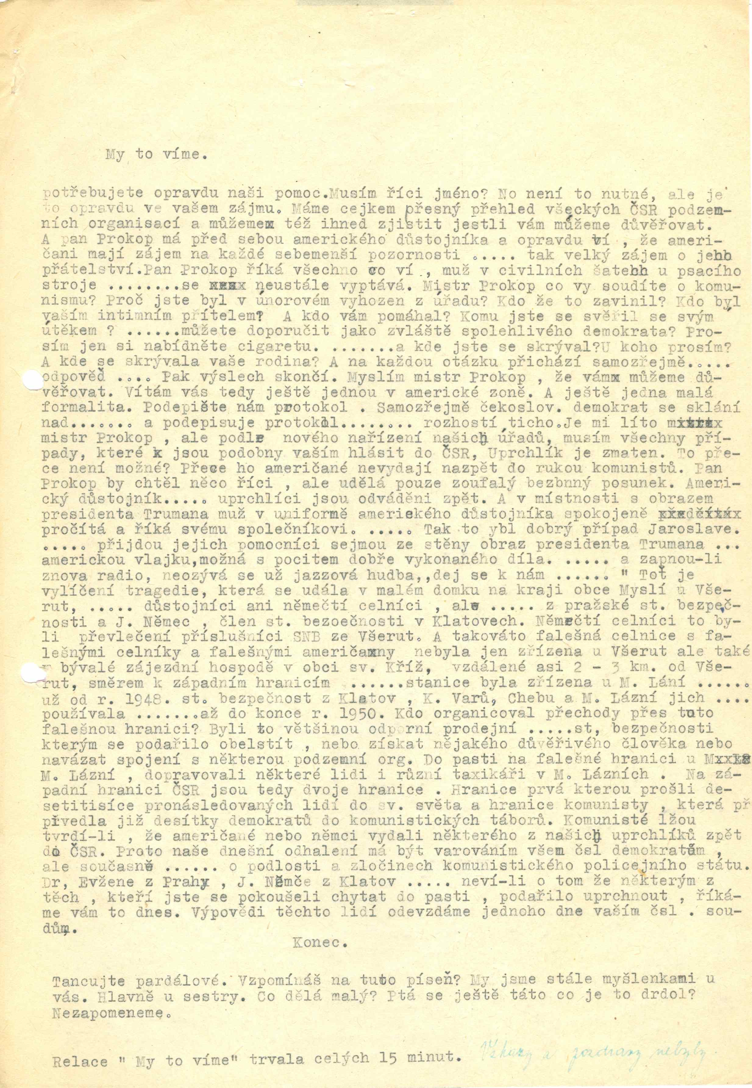 Vaše dnešní reportáž, kterou jsme nazvali…. Vám odhalí jedno zákeřné opatření, kterými komunisté vynucují z lidí pokoušejících se uprchnout přes hranice dobrovolně na západ. Na různých místech v ČSR kolují pověsti že američané a němci vydávají některé českosl. Uprchlíky komunistickým úřadům. Tuto zprávu… skutečnosti aspoň potud, že žádný západoněmecký celník a žádný americký voják nevydal československého uprchlíka do komunistických rukou. Ale stalo se, že…. muži v uniformách amerických celníků a muži v německých uniformách. Na okraji obce Myslí u Všerud stojí opuštěný vkusně zařízený domek. Je to nedaleko bavorských hranic, ale stále ještě na československé straně. A přes to čas od času stojí u tohoto domku německý celník, nebo aspoň muž v uniformě německého vojáka. …Ozve se rázně německé halt. Domek je kupodivu hodně zařízen. Je zde několik uzavřených místností a štítky, které visí na dveřích jsou popsány americkými a německými jmény. ….a v ní několik postelí a dřevěné lavice. Naproti je otevřená jasně světelná místnost. Na čelní stěně této místnosti visí obraz presidenta Trumana a pod ním americká vlajka. A po místnosti se prochází rázným krokem důstojník v americké uniformě. Kouří pravé americké Camelky a občas se zastaví u stolu, na němž leží různě poházená akta….Zachce-li se mu, zapne si rádio a poslouchá jazzovou hudbu amerického armádního vysílání. U psacího stroje sedí ještě jeden. Je oblečen v civilní šaty, ale oblek je zřejmě amerického původu. Tito američané na Č. S. L. území čekají na uprchlíky, aby jim pomohli k doznání, nebo k útěku z Č. S. R. zatím v hotelu Dupák? Ve Kdyni se odehrává zajímavá schůzka. Mladý důvěryhodný muž, který sem jezdí z Prahy a kterého všichni znají, pod jménem Johny, přivedl rodinu ministerského úředníka Prokopa. Prokop je stíhám policií a musí uprchnout. V hotelu Dupák….Prokopovi civilistu, který má k disposici osobní auto v němž bude Prokopova rodina dopravena v noci na hranice republiky. Prokop vyplatil neznámému civilistovi za ….hranice deset tisíc Kč. A večer po setmění vyjíždí z Kdyně černé auto. Veze neznámého civilistu, Prokopa, jeho manželku a dvě děti….Nedaleko stanice SNB auto zastavilo….tímto směrem přejdete hranice…. Jděte stále rovně… neznámý civilista….jak se z dáli ozývá německé halt. Dva příslušníci západoněmecké P.S. odvádějí rodinu Prokopovu….Stanice je osvětlena. Ve dveřích čeká další rozespalý celník. Vedou rodinu do čekárny. Za chvíli se objeví….štíhlý americký důstojník. Pojďte dál prosím. Pan Prokop nechává ženu s dětmi v čekárně a vchází do kanceláře. Že mluvím česky, ale můj otec byl z Prahy a přestěhoval se do New Yorku před první světovou válkou…Tedy mistr Prokop. Jste teď na území amerického okupačního pásma. Jste ve svobodném světě. Nemusíte se bát mluvit, je třeba se bát mluvit v ČSR. My oceníme všechny informace, které nám dáte. Já vám gratuluji, že jste přišel….Nebylo to tak zlé. Pomáhala mi podzemní organisace. Abyste rozuměl mistr Prokop. Můžete nám říci, jen to, co si přejete, co pokládáte za nutné. My na vás vůbec nenaléháme. Ale my musíme být jisti, že jste opravdu politický uprchlík a že potřebujete opravdu naši pomoc. Musím říci jméno? No není to nutné, ale je to opravdu ve vašem zájmu. Máme celkem přesný přehled všeckých ČSR podzemních organisací a můžeme též ihned zjistit jestli vám můžeme důvěřovat. A pan Prokop má před sebou amerického důstojníka a opravdu ví, že američani mají zájem na každé sebemenší pozornosti….tak veliký zájem o jeho přátelství. Pan Prokop říká všechno co ví, muž v civilních šatech u psacího stroje….se neustále vyptává. Mistr Prokop co vy soudíte o komunismu? Proč jste byl v únorovém vyhozen z úřadu? Kdo že to zavinil? Kdo byl vaším intimním přítelem? A kdo vám pomáhal? Komu jste se svěřil se svým útěkem? ….můžete doporučit jako zvlášť spolehlivého demokrata? Prosím jen si nabídněte cigaretu….a kde jste se skrýval? U koho prosím? A kde se skrývala vaše rodina? A na každou otázku přichází samozřejmě….odpověď. ….Pak výslech skončí. Myslím mistr Prokop, že vám můžeme důvěřovat. Vítám vás tedy ještě jednou v americké zóně. A ještě jedna malá formalita. Podepište nám protokol. Samozřejmě českoslov. Demokrat se sklání nad….podepisuje protokol….rozhostí ticho. Je mi líto mistr Prokop, ale podle nového nařízení našich úřadů, musím všechny případy, které jsou podobny vaším hlásit do ČSR. Uprchlík je zmaten. To přece není možné? Přece ho američané nevydají nazpět do rukou komunistů. Pan Prokop by chtěl něco říci, ale udělá pouze zoufalý posunek. Americký důstojník…uprchlíci jsou odváděni zpět. A v místnosti s obrazem Trumana muž v uniformě amerického důstojníka spokojeně pročítá a říká svému společníkovi…Tak to byl dobrý případ Jaroslave….přijdou jejich pomocnícisejmou ze stěny obraz presidenta Trumana….americkou vlajku, možná s pocitem dobře vykonaného díla. ….a zapnou-li znovu rádio, neozývá se už jazzová hudba, dej se k nám….“Toť je vylíčená tragédie, která se udála v malém domku na kraji obce Myslí u Všerut, ….důstojníci ani němečtí celníci, ale …. Z pražské st. Bezpečnosti aj. Němec, člen st. Bezpečnosti v Klatovech. Němečtí celníci to byli převlečení příslušníci SNB ze Všerut. A takováto falešná celnice s falešnými celníky a falešnými američany nebyla jen zřízena u Všerut, ale také v bývalé zájezdní hospodě 
