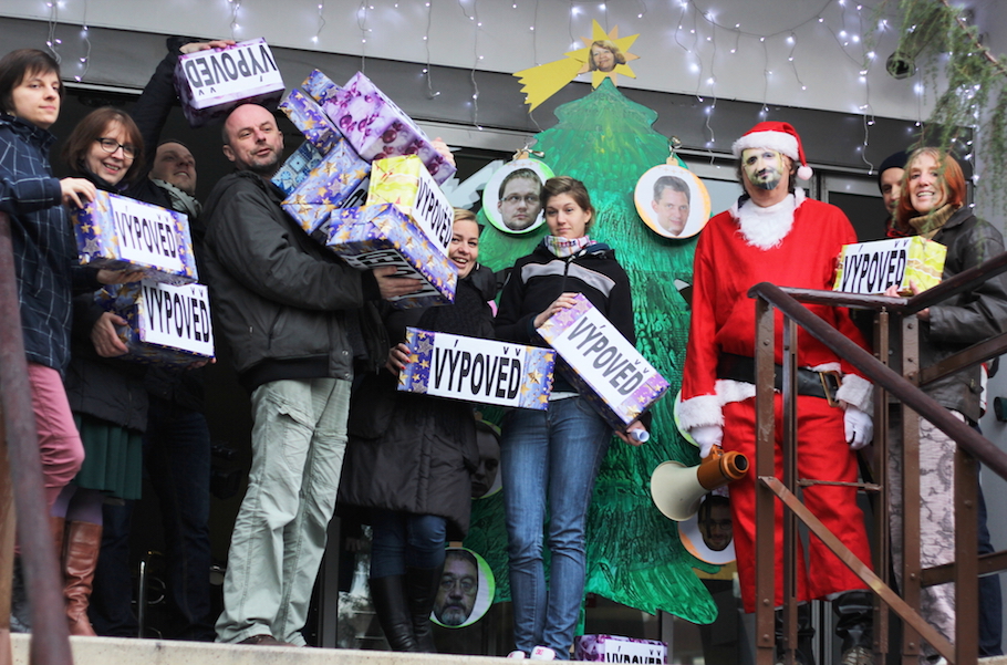 Protestní happening pracovníků Ústavu pro studium totalitních režimů „Hromadné propuštění – vánoční nadílka pro zaměstnance ÚSTR“ (prosinec 2014)