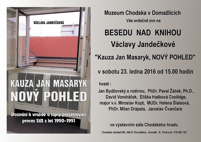 Pozvánka na domažlické setkání nad knihou Václavy Jandečkové Kauza Jan Masaryk (nový pohled)