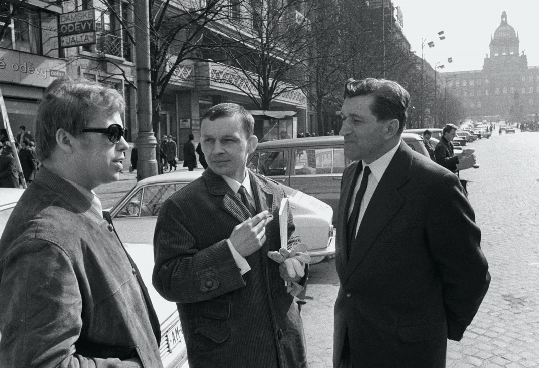 Václav Havel, propuštěný Jan Beneš a jeho právní zástupce Jaroslav Tauš na Václavském náměstí, 23. března 1968 (Zdroj: PaD)