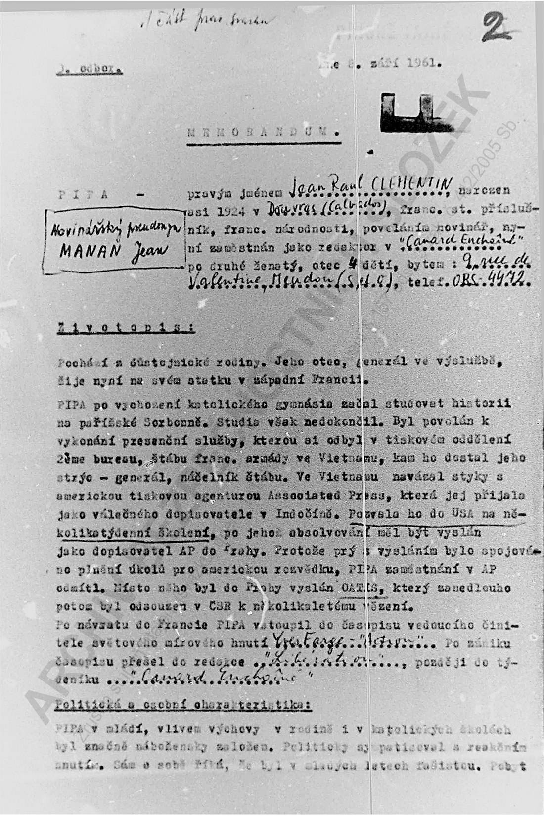 V prosinci 1957 byl zaregistrován osobní svazek 41582 s krycím jménem Pipa. Příslušník 3. odboru 1. správy por. Vladimír Hocek „Háček“ žádá o založení svazku na Jeana Raula Clementina: „s jmenovaným je pracováno jako s agentem a podává zajímavé zprávy“[6] na základě tohoto vágního zdůvodnění byl francouzský novinář zaregistrován jako agent komunistické rozvědky. K prvnímu kontaktů rozvědčíků s ním došlo již v roce 1954, když pracoval v časopisu Liberatión. V době založení svazku již publikoval v Le Canard enchaîné pod pseudonymem Jean Manan. Pocházel z významné rodiny generála a po vystudování katolického gymnázia studoval historii na Sorbonně, studia nedokončil a vojenskou službu vykonával ve štábu francouzské armády v Indočíně. Zde měl pracovat i pro americkou Associated Press, která jej po tříměsíčním školení navrhovala k vyslání jako dopisovatele do Prahy. Vzhledem k požadavku plnění úkolů i pro CIA tuto nabídku odmítl a do Prahy byl vyslán William Nathan Oatis.
