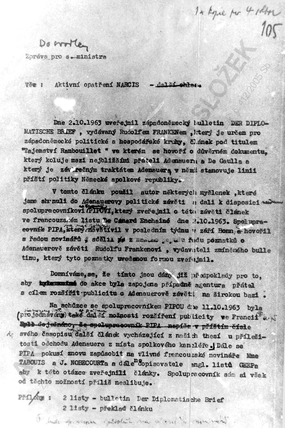 Přes spolupracovníka PIPU bude začátkem října 1963 provedeno AO NARCIS, jehož podstata je vám známa. Přes PIPU hodláme provést fingované politické závěti ADENAUERa a vyvolat tak rozpory jak mezi vedoucími západoněmeckými funkcionáři, tak mezi NSR a jejími hlavními politickými partnery. Úspěch této akce závisí na tom, do jaké míry se podaří spolupracovníkovi PIPOVI prosadit zveřejnění hlavních myšlenek této závěti a zapůsobit dále na publicistickém rozšíření ve francouzském a případně dalším zahraničním tisku. Pro vaši informaci sdělujeme, že je připraven další tiskový ohlas v zahraničí za předpokladu, že se nám podaří přes PIPU tento materiál zveřejnit.