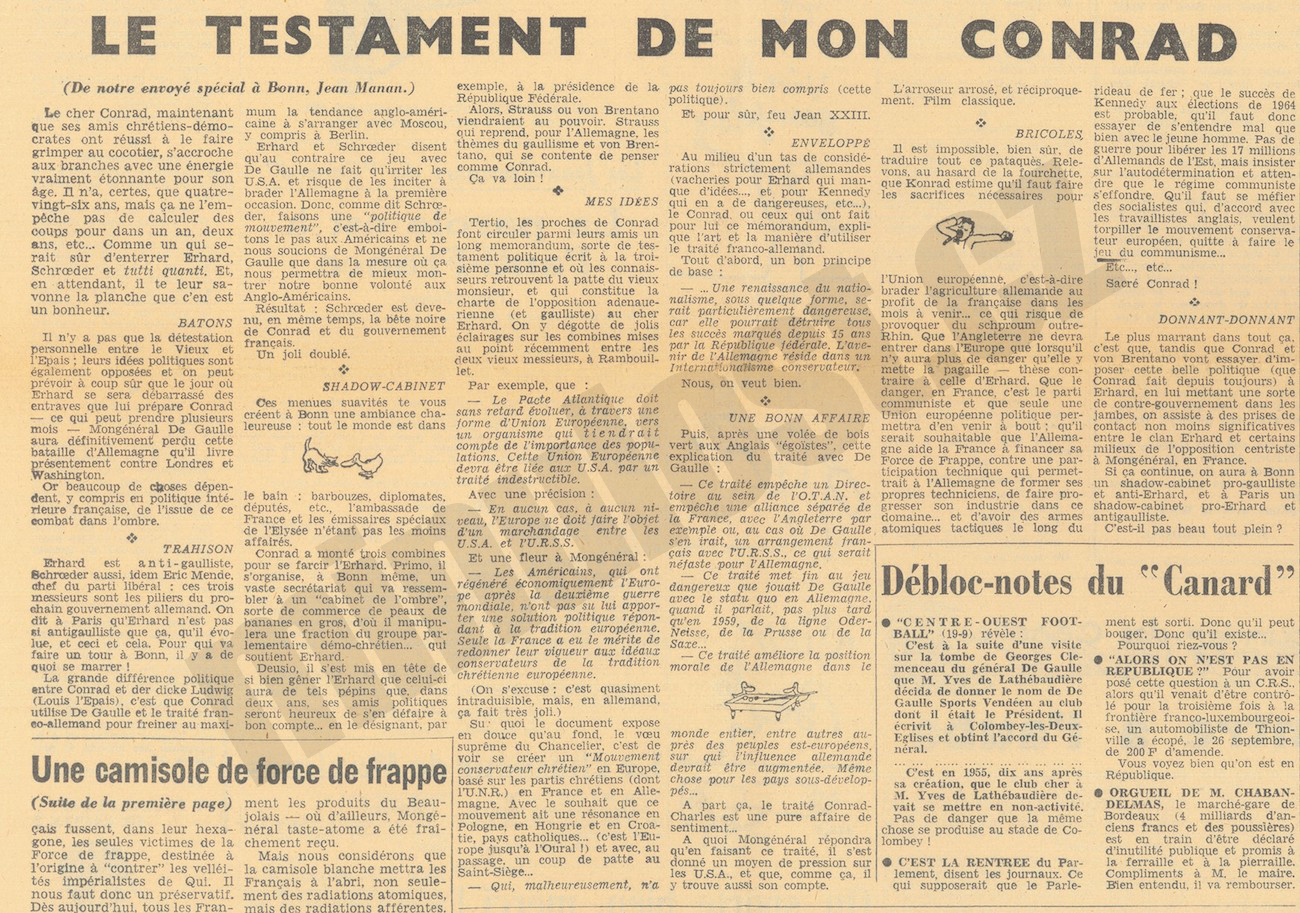 Mezi Starým a Tlustým není jen osobní nenávist: i jejich politické názory jsou protichůdné a můžeme s jistotou předvídat, že v den, kdy se Erhard zbaví překážek, které mu Konrád připravuje, což může trvat několik měsíců, – de Gaulle definitivně ztratí bitvu o Německo, kterou nyní vede proti Londýnu a Washingtonu. A mnoho věcí, včetně ve francouzské vnitřní politice, závisí na výsledku tohoto zákulisního boje..