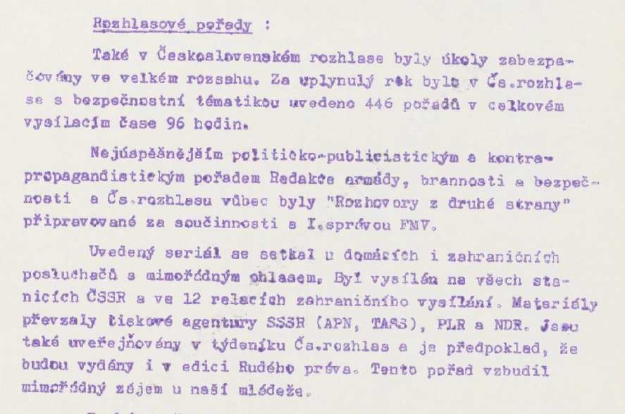 Státní bezpečnost využila nahrávky pořízené prostorovým odposlechem k tvorbě série dezinformačních pořadů s názvem Hovory z druhé strany. Podobný pořad s názvem Rozhovory z druhé strany odvysílal rozhlas již v roce 1974 a šlo o telefonické rozhovory, které nahrál v Západním Berlíně agent čs. rozvědky Ervín Marák.25 V tomto případě se jednalo o aktivní opatření SAKURA proti Rádiu Svobodná Evropa a čs. exulantům.