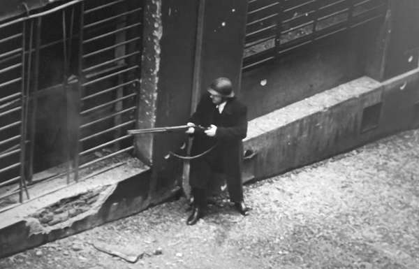 Boj o budovu rozhlasu ve Vinohradské ulici (snímek z filmu Boj o rozhlas)