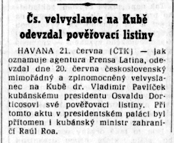 2 Srov. KALVODA, Josef: Role Československa v sovětské strategii. Nakladatelství DÍLO, Kladno 1999, s. 272; PACNER, Karel: Československo ve zvláštních službách. Pohledy do historie československých výzvědných služeb 1914–1989. Díl III. 1945–1961. Themis, Praha 2002, s. 643–644; NÁLEVKA, Vladimír: Fidel Castro. Caudillo 20. století. Nakladatelství Epocha, Praha 2009, s. 54–58; BORTLOVÁ, Hana: Československo a Kuba v letech 1959–1962. FF UK, Praha 2011, s. 129–146.