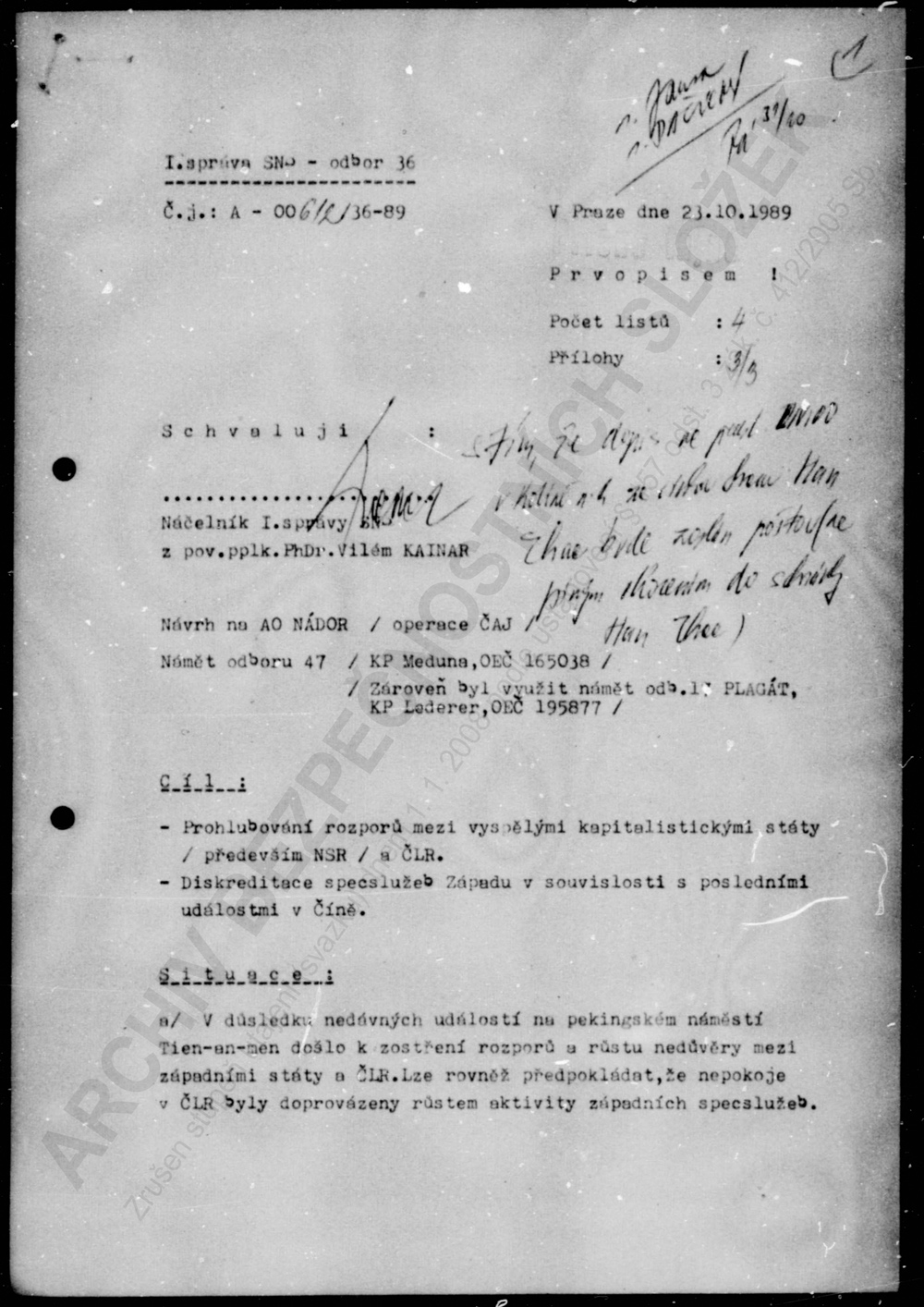 Dňa 14. augusta 1989 bol vypracovaný návrh na aktívne opatrenie s krycím názvom „NÁDOR“ v rámci operácie „ČAJ“. Námet podal príslušník ⟶ I. správy FMV kpt. PhDr. Zdeněk Záliš „Meduna“ z ⟶ 47. odboru (Stredný a Ďaleký východ) pre ⟶ 36. odbor aktívnych opatrení. Po zapracovaní spresňujúcich usmernení k uskutočneniu operácie bol návrh aktívneho opatrenia nakoniec schválený až 23. októbra 1989 povereným náčelníkom rozviedky ⟶ pplk. PhDr. Vilémom Václavkom s krycím menom Kainar.