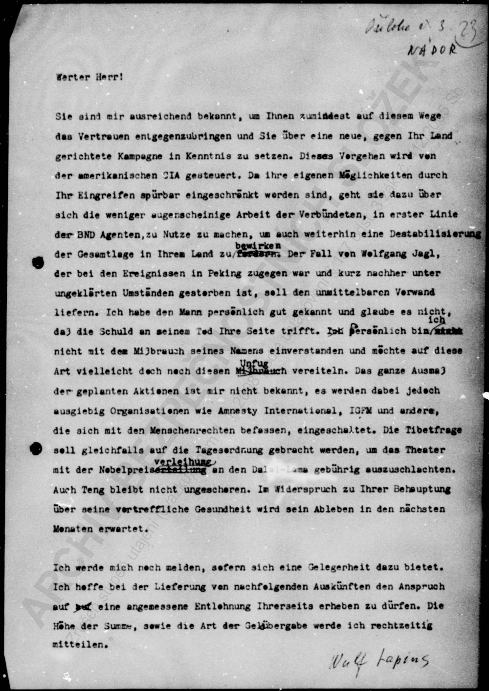 jste mi dostatečně znám jako člověk, kterého je možné alespoň touto cestou informovat o přípravě nové kampaně, zaměřené proti vaší zemi. Tato akce je řízená a koordinovaná americkou CIA, která potom, co jste jí stížili podmínky její činnosti v Pekingu, chce využívat doposud méně nápadné práce spojenců, především z rad agentů BND k další destabilizaci celkové situace u vás. Jako bezprostřední záminky má byt využito případu Wolfganga Jagla, který se při událostech v Pekingu pohyboval, a který krátce nato za záhadných okolností zemřel. Dobře jsem ho znal a nevěřím, že odpovědnost za jeho smrt nese vaše strana. Osobně nesouhlasím se zneužíváním jeho jména a volím alespoň tuto formu v naději, že tomu ještě zabráním. Celý rozsah plánovaných akcí mi znám není, budou v nich však kromě jiného ve větší míře zapojeny organizace typu Amnesty International, IGFM a další, které se specializují na lidské práva. Využívat jse bude rovněž Tibetu, který po zinscenování udělení Nobelovy ceny míru dalajlámovi je vděčným polem působnosti. Ušetřen nezůstane ani Teng jehož smrt se v rozporu s vaším tvrzením o jeho dobrém zdravotním stavu, očekává v nejbližších měsících. Pokud budu mít příležitost, ještě se ozvu. Předpokládám, že další informace budou z vaší strany vyváženy patřičnou finanční částkou. Způsob předání peněz včas oznámím, včetně částky, kterou budu požadovat.