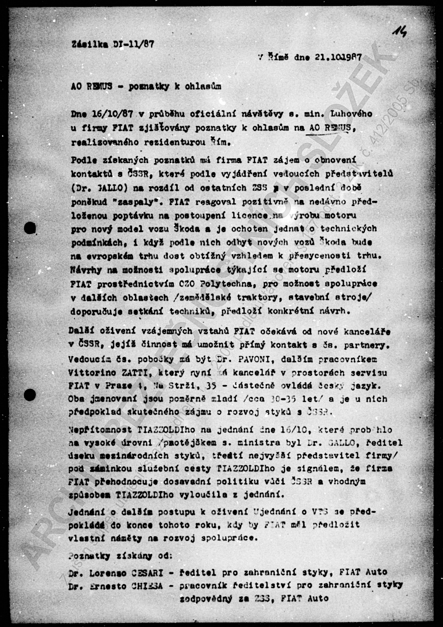 Aktívne opatrenie „REMUS“ bolo vyhodnotené ako veľmi účinné. Diskreditácia Alberta Tiazzoldiho a oživenie dohody boli úspešné. Tazzioldi už nebol prítomný na rokovaní s ČSSR 16. októbra 1987 s čs. ministrom Ladislavom Luhovým, tam FIAT zastupoval Gallo. Tazzioldiho elegantne odstavili a ospravedlnili z rokovaní pre inú naliehavú obchodnú cestu. Jeho neprítomnosť signalizovala obrat. FIAT reagoval pozitívne na postúpenie licencie na vyrábanie nového modelu motoru Škoda a bol ochotný jednať o technických podmienkach. Bola zriadená nová kancelária FIAT-u. Vedúcim čs. pobočky bol menovaný Enrico Pavoni (v rokoch 1978-1990 zástupca spoločnosti FIAT v Poľsku, II. správa FMV ho rozpracovávala vo zväzku preverovanej osoby s krycím menom PAV) a ďalej mal spolupracovať s Vittorinom Zattim ( II. správa FMV ho rozpracovávala vo zväzku preverovanej osoby s krycím menom FIAT), ktorý mal vtedy kanceláriu v priestoroch servisu FIAT v Prahe 4. Obaja noví predstavitelia FIAT-u boli pomerne mladí a vyhovovali čs. predstavám. [4]