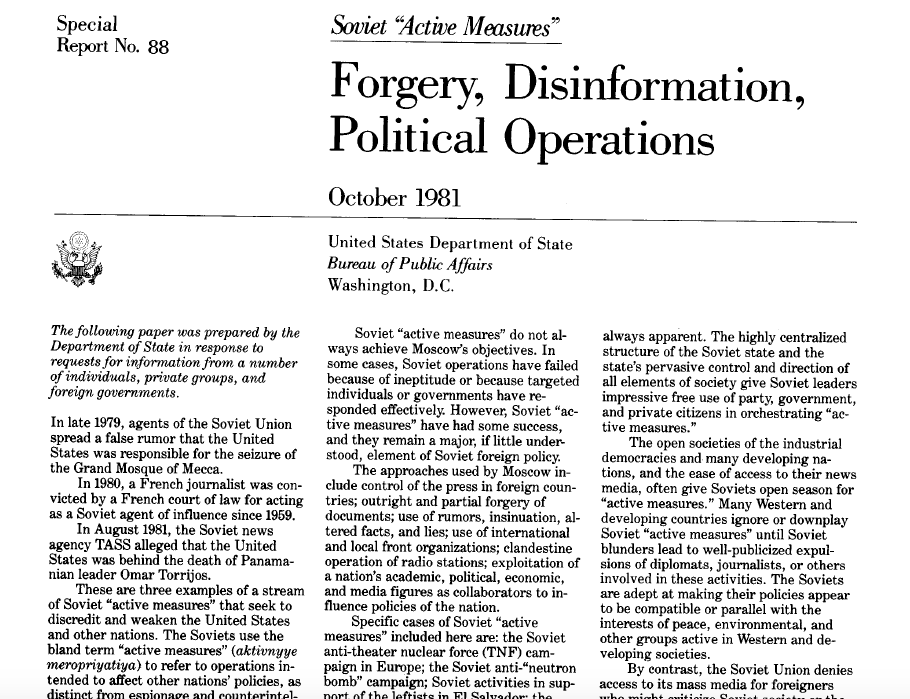 V našem seriálu o dezinformacích představujeme americký dokument Ministerstva zahraničních věcí USA z října 1981, adresován je jedincům, skupinám a zahraničním vládám. Jedná se o první dokument společné vládní pracovní skupiny pro odhalování aktivních opatření (The Interagency Active Measures Working Group), kterou nejdříve řídilo americké ministerstvo zahr. věcí a později tisková agentura (United States Information Agency). Skupina vznikla v r. 1981 v době Reaganovy administrativy. Dokument popisuje sovětské aktivity v oblasti podvrhů, dezinformací a politických vlivových operací.1 Podrobněji popisuje vybrané operace SSSR proti USA z přelomu sedmdesátých a osmdesátých let 20. století. Částečně identifikuje osoby (novináře, politiky) jako „nástroje“ vlivových akcí, a poukazuje na význam a využitelnost dobových médií (rozhlas, tisk) a předních organizací ve svobodném a rozvojovém světě pro zahraniční politiku SSSR. Lze předpokládat, že zdrojem pro tento dokument mohly být informace od agentů v zájmovém prostoru, resp. uvnitř východoevropských a sovětských zpravodajských služeb a rovněž od zpravodajských důstojníků, kteří defektovali k Američanům. Některé operace, které dokument uvádí, měli svůj dopad i na veřejnost ve východním bloku. Pro ilustraci u vybraných operací uvádíme jejich odraz v dobovém československém komunistickém tisku.