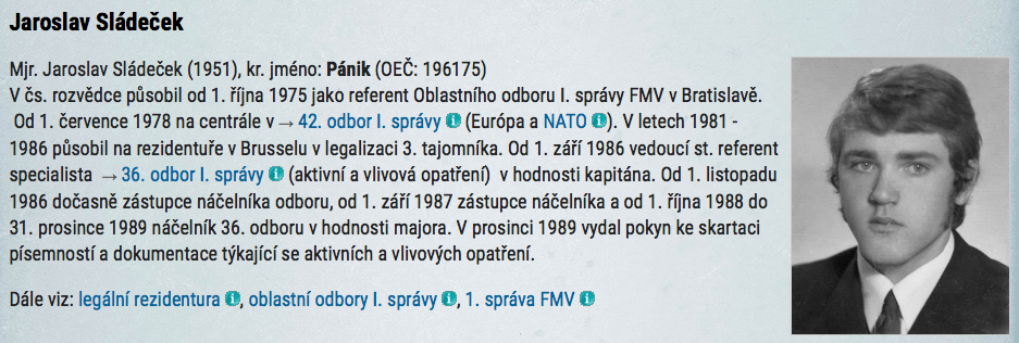 [3]Vlastnoruční podpis: mjr. Páník 23/2/[19]89. Mjr. Jaroslav Sládeček – „Pánik“ (nar. 1951), od 1. 10. 1988 do února 1990 náčelník 36. odboru I. S‑SNB.