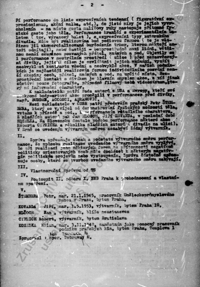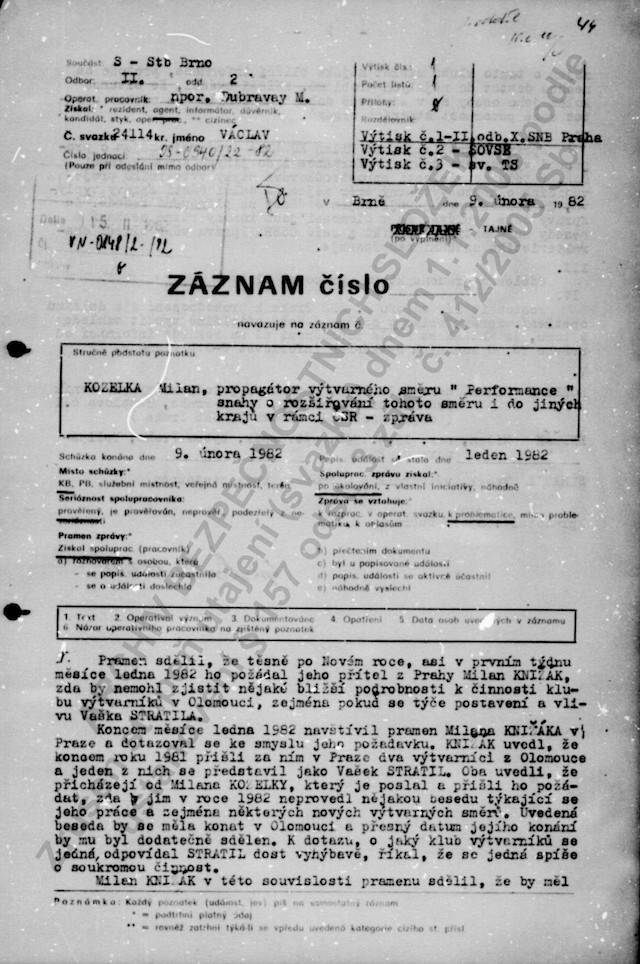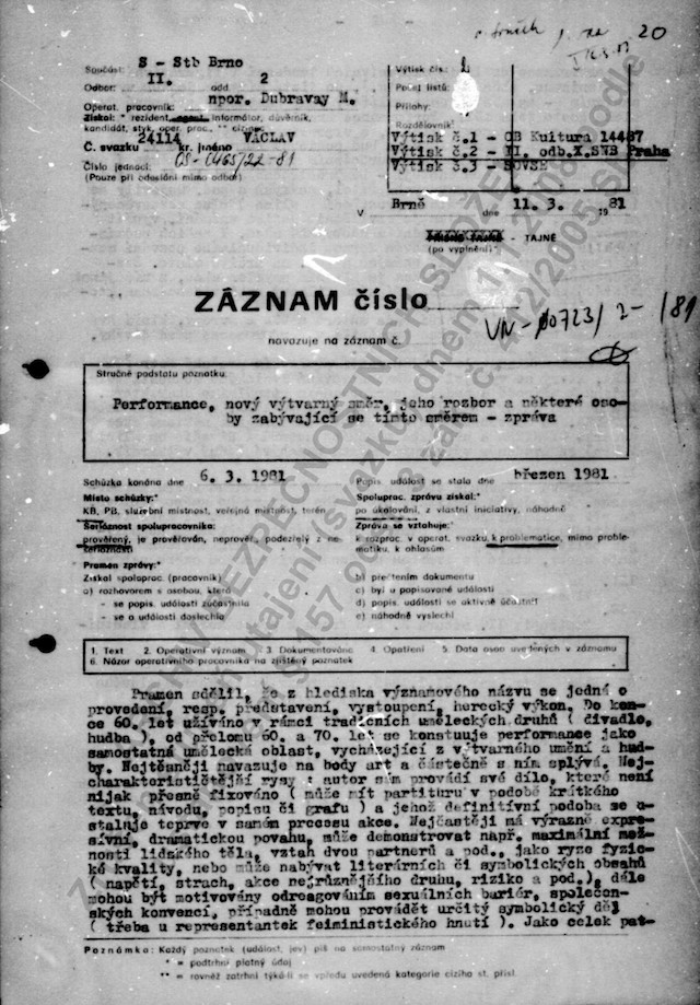 Tento akční umělec se však mýlil, když v roce 1996 v autobiografické reflexi svých uměleckých aktivit napsal, že do jeho ateliéru chodili „lidé, které nikdo nezval, měli drahé fotoaparáty a úžasnou výdrž. To byli fízlové a práskači – výslechy následovali s týdenním odstupem.“[13]Ve svazku, který na něho vedla StB, nejsou udání od lidí, které neznal, ale agenturní zprávy od osob, které naopak znal velice dobře: například od vlivného kritika výtvarného umění, výtvarníka a držitele mnoha uměleckých ocenění Miroslava Klivara nebo Jiřího Valocha.[14]