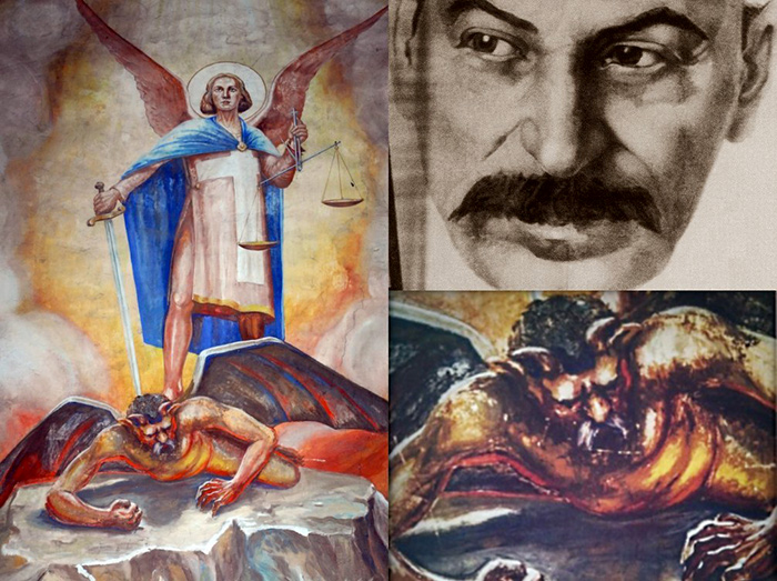 Jedno velice zajímavé dílo z oné doby se stalo již turistickou atrakcí. Nenachází se na území Čech ani Slovenska, ale na maďarsko-rakouské hranici v pohraničním maďarském městečku Šopron. Zde se v roce 1948 po vysídlení z Československa usadil akademický malíř Zoltán Básthy s rodinou. V místním karmelitánském kostele v části Bánfalva vytvořil v roce 1950 nástěnné fresky a další výzdobu interiéru. Jeho dílo by snad nebylo ničím odlišné od jiných podobných sakrálních maleb, kdyby jeho součástí nebylo mnoho známých osob tehdejší doby. Ve výjevu Ježíší se klaní svět tak můžeme například vedle Jozsefa kardinála Mindszentyho, maďarského římskokatolického primase (v době vzniku fresky v komunistickém žaláři), spatřit rovněž papeže Pia XII. Nejzajímavějším a nejodvážnějším je výjev Archanděl Michael vítězí nad Satanem (na obrázku), který se nachází pod chórem. V tomto výjevu autor vyobrazil padlého démona jako Stalina. Když si uvědomíme, že v té době všude kolem probíhala rozsáhlá perzekuce církví maďarskými komunisty, můžeme tento Básthyho počin z roku 1950 klasifikovat téměř jako odbojovou činnost. Dobovou propagandou nezatížený, všech oslavných atributů zbavený prostý nadčasový obraz ateistického „poloboha“ v okamžiku pravdy. Umělecké znázornění a personifikace zla jako komunistického vůdce budí vůči autorovi respekt a uznání. Zvěčněná myšlenka, která nám i dalším generacím připomíná, že máme právo rozhodnout se, čemu chceme sloužit.