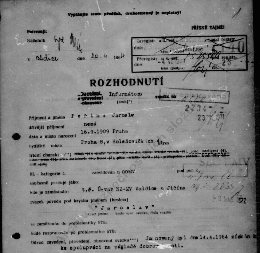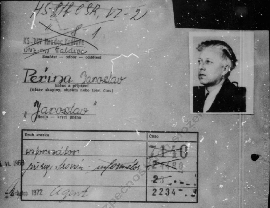Agenta Jaroslava Peřinu získala Státní bezpečnost ke spolupráci v době jeho věznění ve Valdicích u Jičína 14. dubna 1964, kde si odpykával trest za majetkovou trestnou činnost. „Spolupráci přijal ochotně a přitom slíbil naprosto poctivou a seriózní spolupráci.“[4] K velké smůle mnoha poctivých lidí, svůj slib dodržel. Na zásah Státní bezpečnosti byl o rok později po uplynutí půlky trestu propuštěn a okamžitě úkolován do prostředí bývalých sociálních demokratů, neboť šlo o bývalého člena ÚV sociálně demokratické strany. Vzhledem ke skutečnosti, že jej německé úřady za války věznili v koncentračním táboře a počátkem padesátých jej dva měsíce vyslýchala Státní bezpečnost, pasoval sám sebe do role politicky pronásledovaného občana. „Prostřednictvím „Jaroslava“ tak byly získány nejzávažnější poznatky a dokumenty o kontrarevoluční činnosti organizátorů ÚPV-SDS (Ústřední přípravný výbor Sociálně demokratické strany pozn. aut.) v krizových letech 1968-69. Přes jeho osobu a s jeho vědomím byl použit úkon TA-122 (krátkodobý prostorový odposlech pozn. aut.) ke kontrole důležitého zasedání ÚV-SDS dne 21. 6. 1968.“[5] Na rozdíl od mnoha jiných agent Jaroslav zůstal Státní bezpečnosti věrný i po invazi v srpnu 1968. Odměnou mu byly každoroční výjezdy do zahraničí, při kterých plnil operativní úkoly StB. V zahraničí se pravidelně setkával s Přemyslem Janýrem, který spolupracoval s Jiřím Pelikánem a Pavlem Tigridem a pomáhal organizovat přepravu zakázaných časopisů a knih do Československa. V září 1974 se poprvé podařilo vyslat agenta Jaroslava do Francie s úkolem „zlepšení styku a spojení“ domova se zahraničím. V Paříži se sešel s Pavlem Tigridem, který mu slíbil zasílání exilových materiálů vnitřní poštou z Československa. Na schůzce 3. prosince 1974 již agent předal zásilku exilové literatury, kterou obdržel poštou a smluveným způsobem její přijetí potvrdil Pavlu Tigridovi. V srpnu 1975 se již agent Jaroslav zařadil do distribučního kanálu. V návrhu na zvedení signálního svazku na Hanse Petera Mayera z 12. února 1976 se dočteme „Mayer přicestoval v srpnu 1975 a v lednu 1976. Pokaždé přivezl značné množství ideodiverzních materiálů, které předal našemu TS Jaroslav. Při předávání uvedl, že je přiváží od „přítele“ z Kolína n/Rýnem. Mayer spolupracovníka ujistil, že nemusí mít žádné obavy, není v podezření, neboť materiály nepřevážel on Mayer, ale spolehliví řidiči nákladních automobilů TIR z NSR. Mayer je od nich přebírá až na území ČSSR. Setkávání Mayera s řidiči dohodl také „přítel“. (…) Mayer spolupracovníkovi sdělil, že mimo něj přivezl obdobné materiály dalším dvěma čsl. Občanům. V jednom z nich byl ustanoven Karel Zahradníček 27. 2. 1908. (…) Druhého adresáta se nepodařilo zjistit.[6] Peter Mayer přivezl v srpnu 150 výtisků Listů a čtyři výtisky Svědectví a v lednu 300 výtisků Listů a 12 kusů Svědectví. Karla Zahradníčka poznal agent Jaroslav na fotografii, kterou mu předložila StB.[7] V lednu 1976 již agent Jaroslav hlásí příjezd vozu Volkswagen SPZ BN-VY-256 se kterým přicestoval Hans Gross a předal mu materiály k distribuci v Československu. Jaroslav ve svém udání podrobně popsal, kde jsou v dodávkovém autě vytvořeny úkryty pro pašování tiskovin. Agent potvrdil Pavlu Tigridovi přijetí zásilky a obdržel ze zahraničí 454 TK (tuzexových korun). Následně Státní bezpečnost pomocí sítě svých agentů zajistila potvrzení o distribuci časopisů do zahraničí. Tajné policii se poprvé podařilo ovládnout jeden z hlavních distribučních kanálů exilové literatury do Československa. Agent Jaroslav byl pod kontrolou svého dlouholetého přítele Jiřího Loma, o kterém netušil, že i on je důležitým agentem Státní bezpečnosti. Další kurýr přicestoval do Československa 3. dubna 1977, před hotelem Evropa se sešel s agentem Jaroslavem, který jej okamžitě udal a tím umožnil jeho sledování až do odjezdu z Československa.