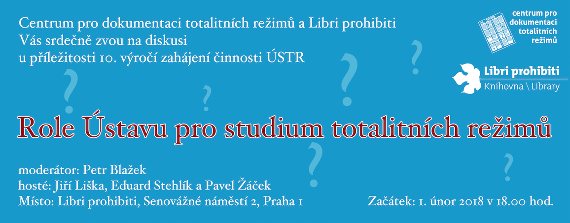 Přinášíme záznam diskuse Centra pro studium totalitních režimů na téma Role Ústavu pro studium totalitních režimů ze dne 1. února 2018, která se uskutečnila ve spoloupráci a v prostorách knihovny Libri Prohibiti při příležitosti 10. výročí zahájení činnosti Ústavu. Pozvání přijali pan Jiří Liška, Eduard Stehlík, Pavel Žáček a Jan Kalous. Moderátorem diskuse byl Petr Blažek.